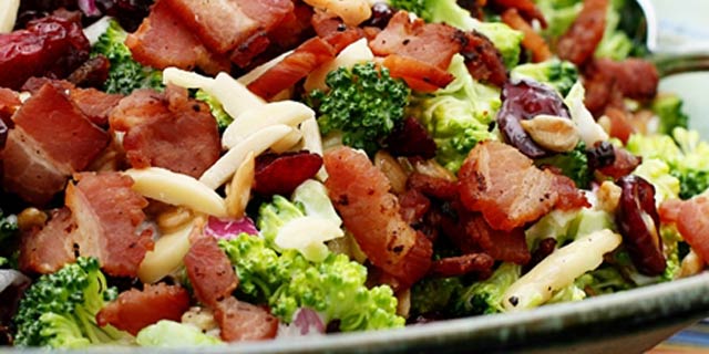 Подготовка: Брокулата на помали цветови и да се готви во врела вода не подолго од две минути. Извадете ја брокулата од водата и оставете да се исуши. Посолете ја сланината, а потоа исечете ја на помали парчиња и додека не зарумени пржете ја на тефлонска тава без масло. Измешајте ги брокулата и сланината и зачинете ја салатата со маслиново масло и сок од лимон. Попрскајте со ситно сечкан лук (или лук во прав) и сечкани црни маслинки.